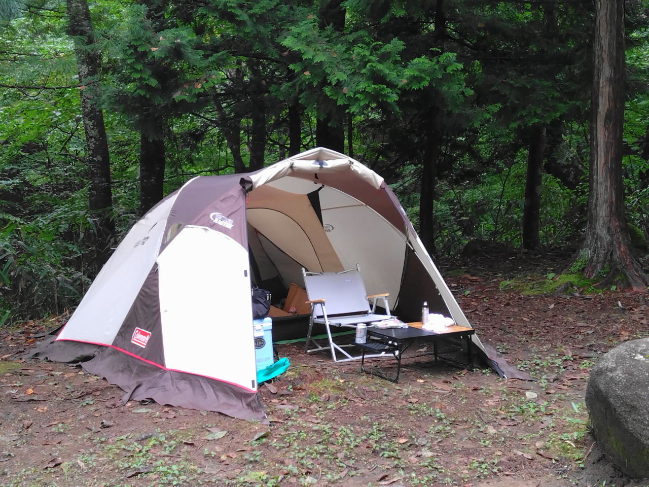 いつもの川沿いのところは先客がいたので、川沿いではない2番目のサイトへ。荷物が多いからここしか無理なんだよな。テントを設営して早速釣りへ。