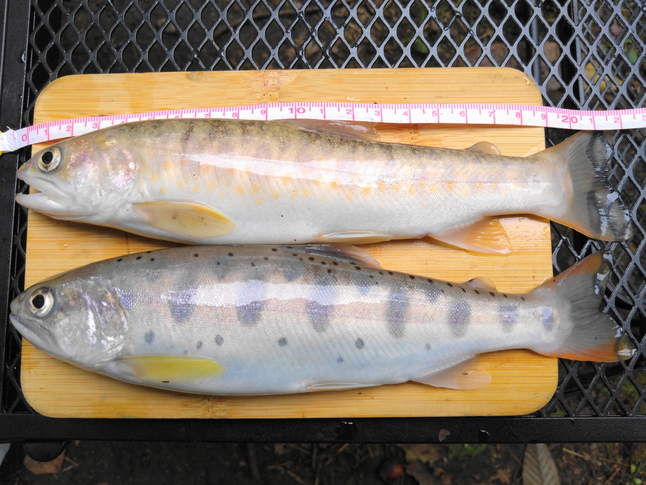 キャンバーが沢山いる近くで、22cmの結構良型のイワナとヤマメが釣れました。多分竿抜けした魚と思われます。ラッキーでした。