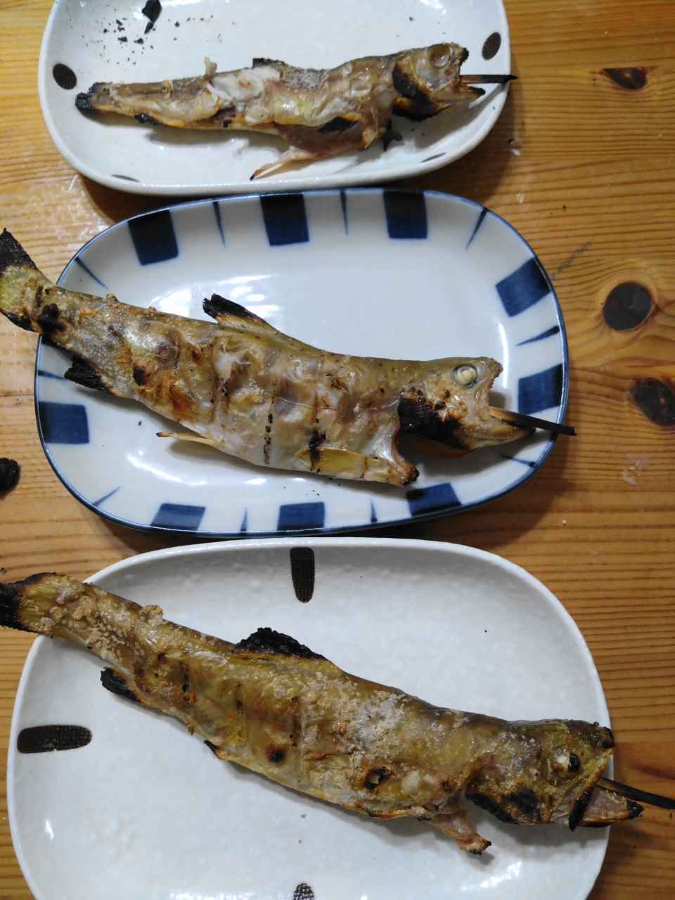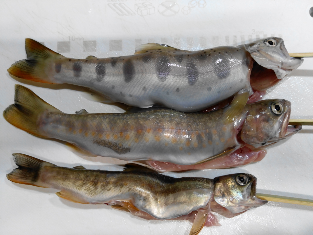 釣果はトータル10匹!でした、イワナ4匹、ヤマメ6匹。こんな大漁なの久しぶり。こんな小さな渓流の釣り場でも釣れるときは釣れるんだと納得。塩焼き用の串差しにして娘夫婦やママの友人へおすそ分けへ。